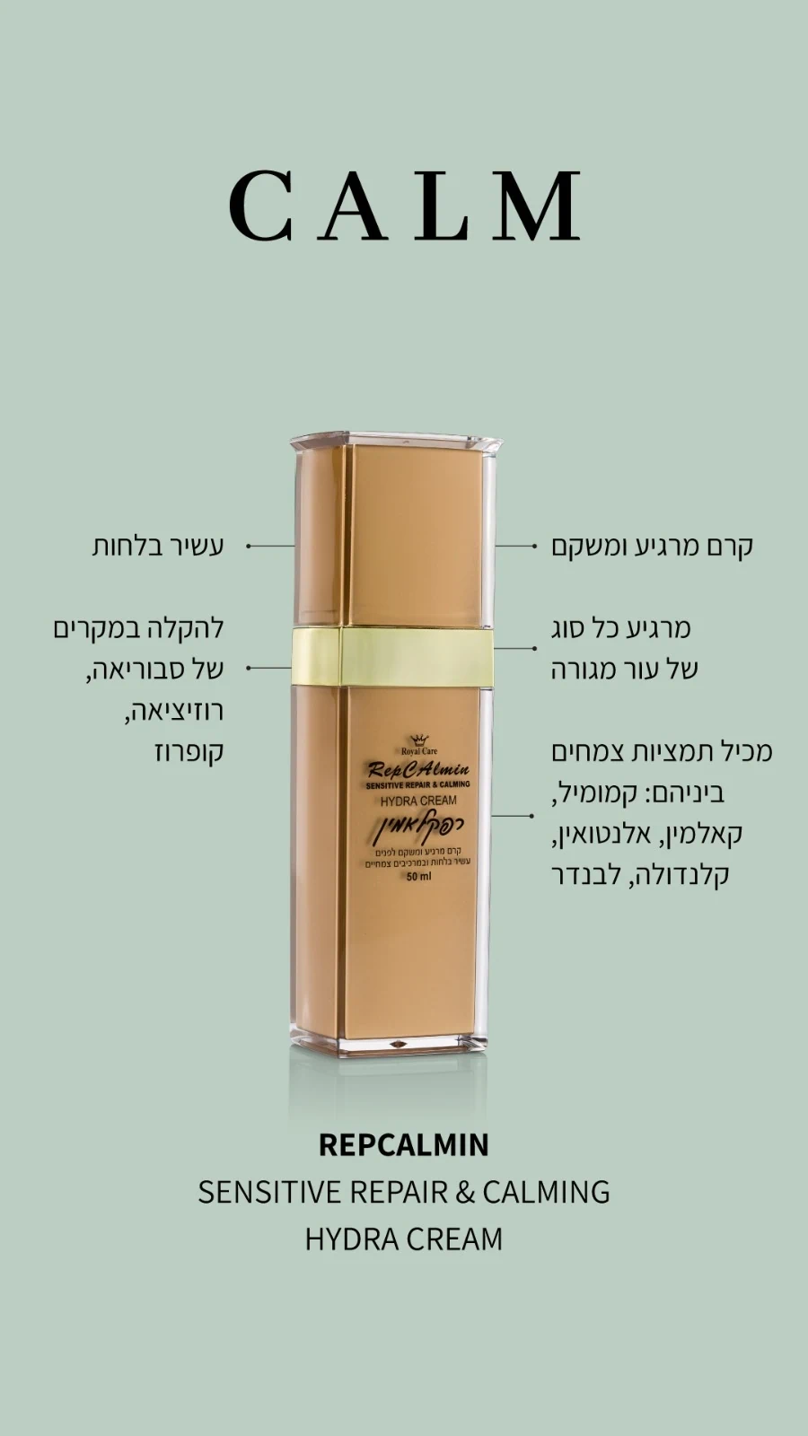 הפורמולה החדשנית של Repcalmin משלבת רכיבים פעילים מרגיעים ומשקמים, הפועלים להפחתת גירויים, אדמומיות ותחושת צריבה – ומשיבים לעור את האיזון, הלחות והנוחות.