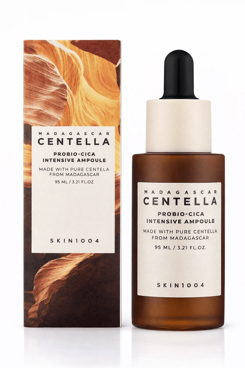 אמפולה אינטנסיבית מבית SKIN1004 המשלבת Centella Asiatica ממדגסקר יחד עם קומפלקס Probio-Cica, לחיזוק מחסום העור, הרגעה עמוקה ושיפור מראה כללי של העור.
